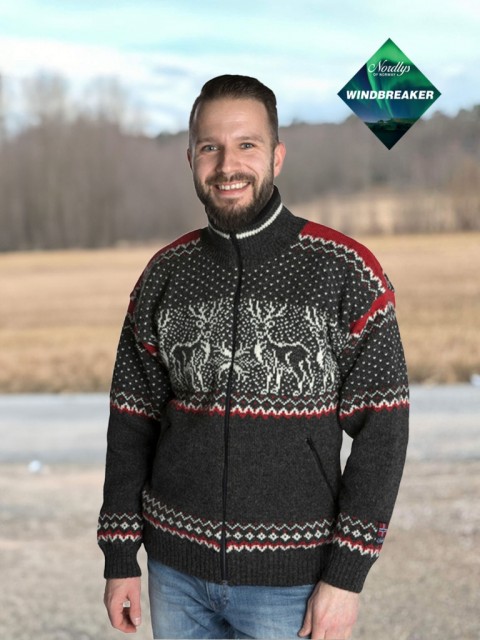 Nordlys Vestland vindtett strikket ulljakke til dame og herre koksgrå natur rød